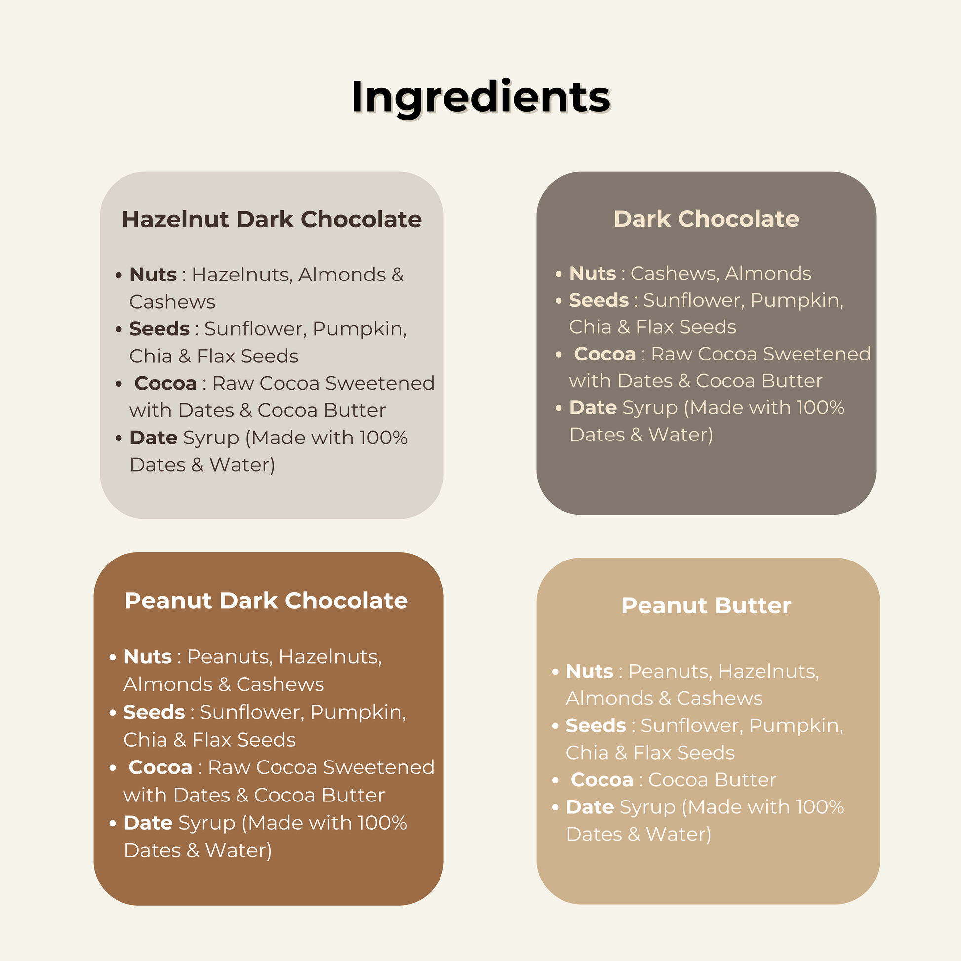 Crafted with high quality raw chocolate, sweetened naturally with dates, and combined with wholesome ingredients that are actually good for you. Whether you love to mix and match or stick to your favorite flavor, this box is your way to snack smart and deliciously.