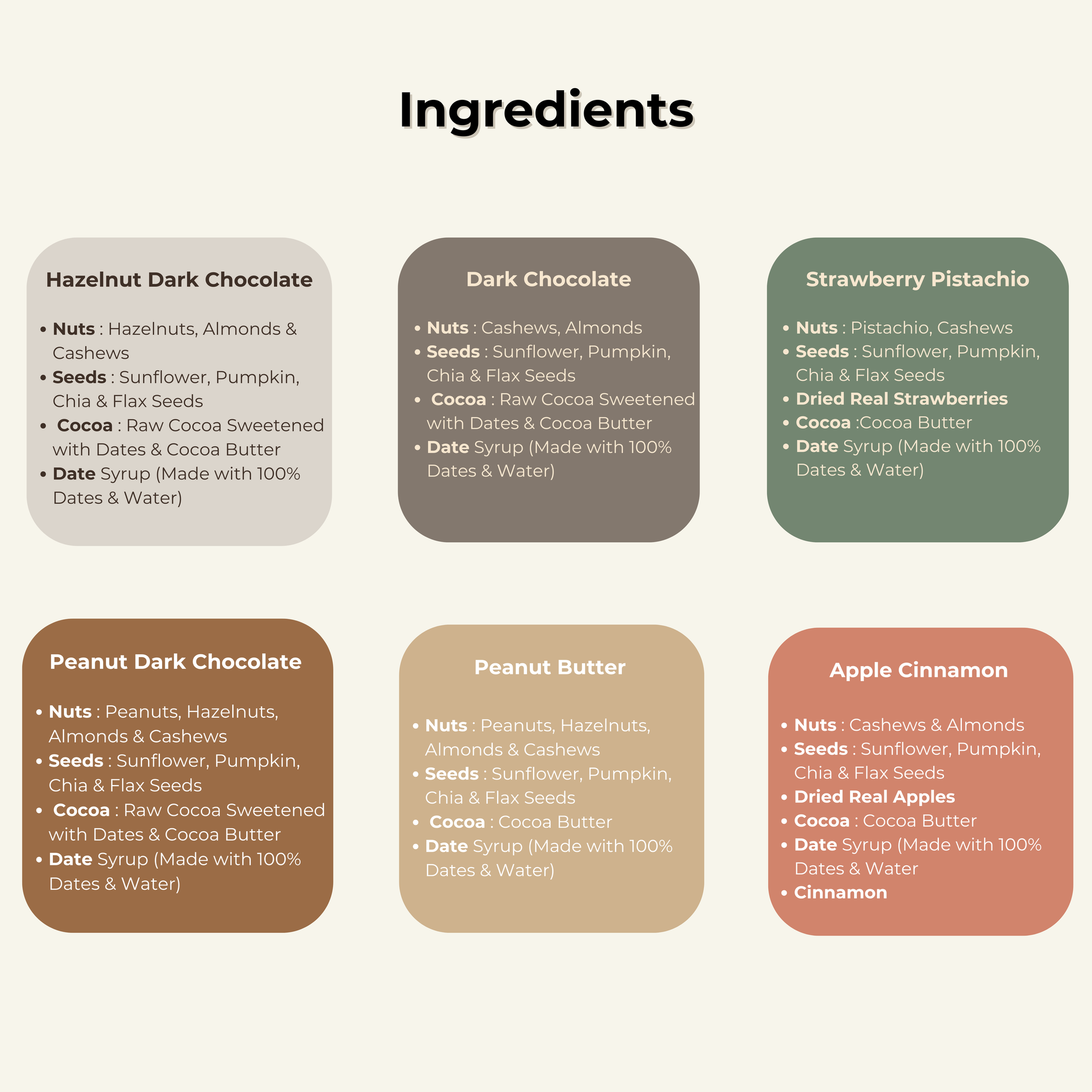 Crafted with high quality raw chocolate, sweetened naturally with dates, and combined with wholesome ingredients that are actually good for you. Whether you love to mix and match or stick to your favorite flavor, this box is your way to snack smart and deliciously.